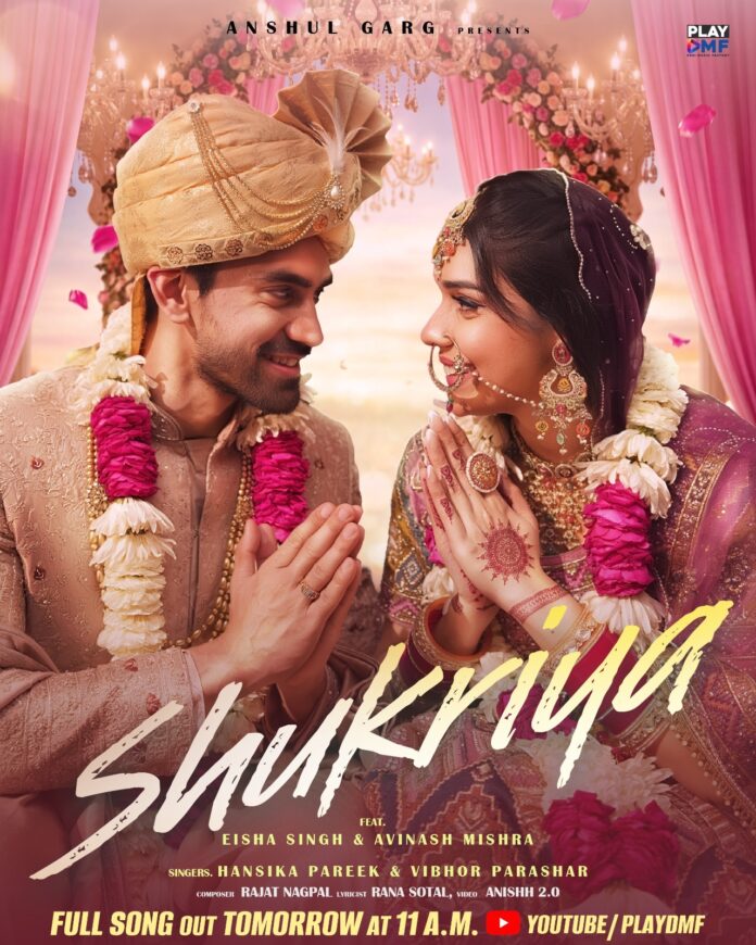 The music video shows Avinash and Eisha in a cute love story and going through wedding rituals with each other, including haldi and pheras. The audience is elated with excitement of their reunion, and the spark of the chemistry between the two has taken the internet by storm, with fans raving about their bond on screen. Shukriya is sung by Hansika Pareek and Vibhor Parashar, with music by Rajat Nagpal.