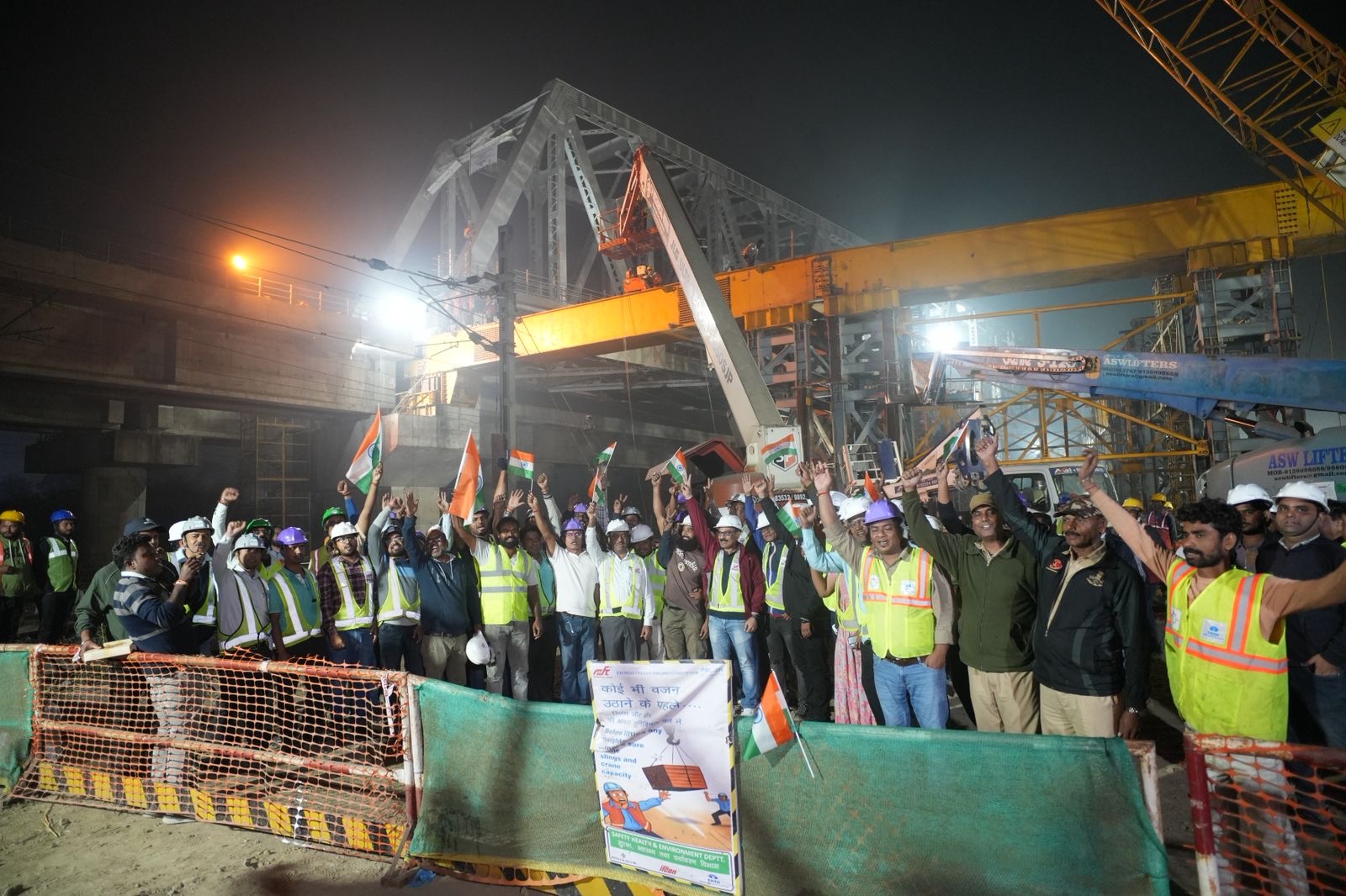 The installation posed significant engineering challenges due to the massive size of the girder and the requirement for precise placement. The structure was erected over an active Indian Railways track through a 32-metre radial shifting operation, executed using advanced construction techniques, meticulous structural calculations and carefully planned sequencing. The complex operation was carried out during night hours with the support of heavy-duty cranes and hydraulic jacks. Despite adverse weather conditions and operational constraints, the work was completed safely and within the stipulated timeframe.