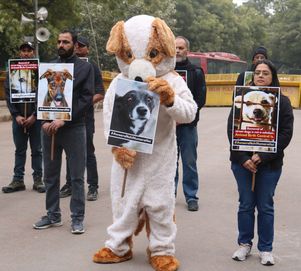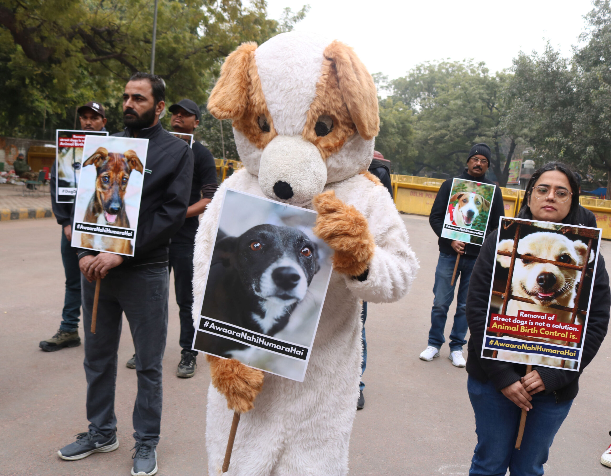 New Delhi(Shyam Sunder): Dog lovers wearing life-size dog costumes and holding placards staged a protest at Jantar Mantar in New Delhi on Saturday against the removal of street dogs, ahead of a Supreme Court hearing on the issue.