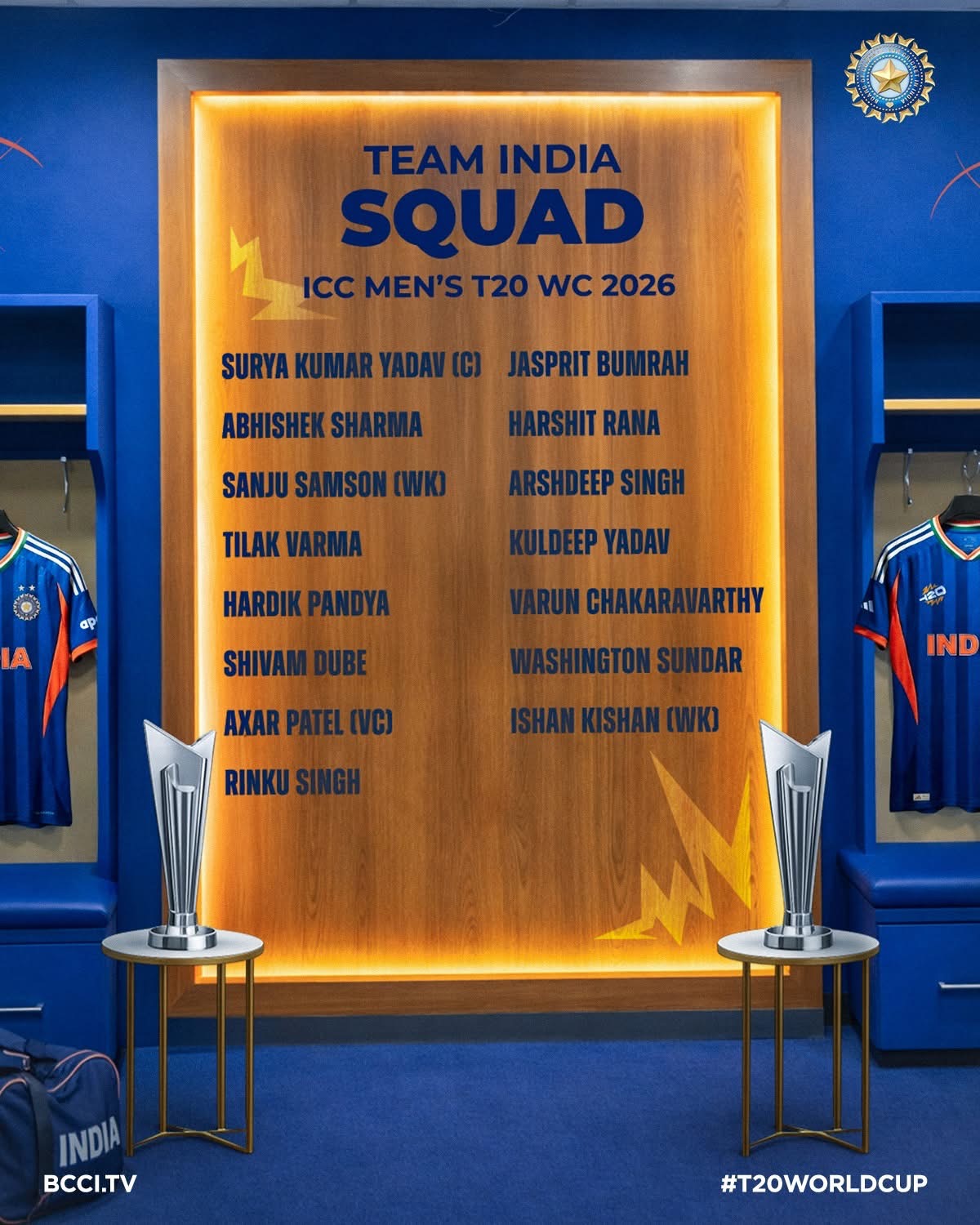 HomeNewsIndia’s squad for ICC Men’s T20 World Cup 2026 announced NewsSports India’s squad for ICC Men’s T20 World Cup 2026 announced Shubman Gill Out, Ishan Kishan In By FD Desk December 20, 2025 0 21 Share FacebookTwitterPinterestWhatsApp Share FacebookTwitterPinterestWhatsApp Previous articleBigger Checks, Thinner Ice — Why Big-Budget Films Are Starting To SweatNext articleHyderabad Will Host the World’s Only B2B Exhibition for Fan and Fan Technology in February 2026 FD Deskhttps://focusdelhi.in RELATED ARTICLES Delhi Chief Minister Mamata Banerjee address reporters after meeting with the Election Commission February 2, 2026 Delhi राष्ट्रपति श्रीमती द्रौपदी मुर्मू ने अमृत उद्यान का उद्घाटन कर भ्रमण किया February 2, 2026 Delhi सेंट्रल डिस्ट्रिक थाना आनंद पर्वत की सतर्क व सक्रिय पुलिसिंग से कुख्यात लुटेरा गिरफ्तार February 1, 2026 LEAVE A REPLY Cancel reply Comment: Please enter your comment! Name:* Please enter your name here Email:* You have entered an incorrect email address! Please enter your email address here Website: Save my name, email, and website in this browser for the next time I comment. - Advertisment - Most Popular How the School of Sciences at JAIN (Deemed-to-be University) Is Shaping the Next Generation of Microbiology Leaders February 4, 2026 Designing Tomorrow: How JAIN’s BSc Interior Design Is Shaping the Next Generation of Spatial Innovators February 4, 2026 Nifty Project Management and Operations Strengthens India’s Education Ecosystem Through Technology-Driven Learning Solutions February 4, 2026 Shaping Minds, Strengthening Society: JAIN’s MSc Psychology Program Redefines Professional Training in Mental Health and Human Behaviour February 4, 2026 Load more Recent Comments deepak on Boycott Turkey: JNU suspends MoU with Turkey’s Inonu University over national security concerns gaurav on Boycott Turkey: JNU suspends MoU with Turkey’s Inonu University over national security concerns