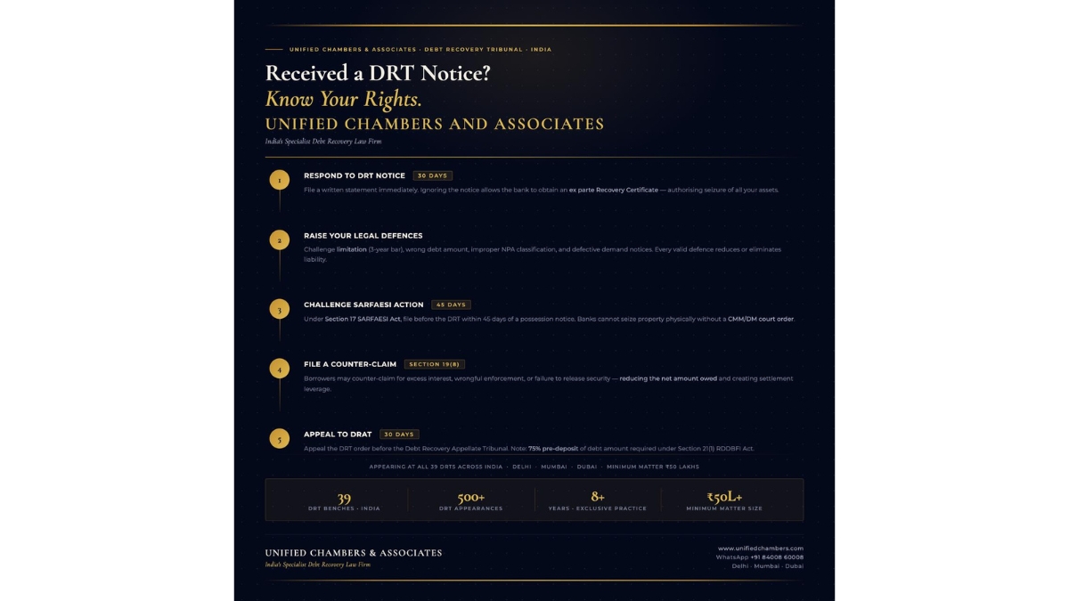 Unified Chambers and Associates, a specialist debt recovery law firm appearing across all 39 Debt Recovery Tribunals and 5 Debt Recovery Appellate Tribunals in India, has published this guide to help borrowers, MSMEs, and guarantors understand what happens at DRT — and what they can do about it.